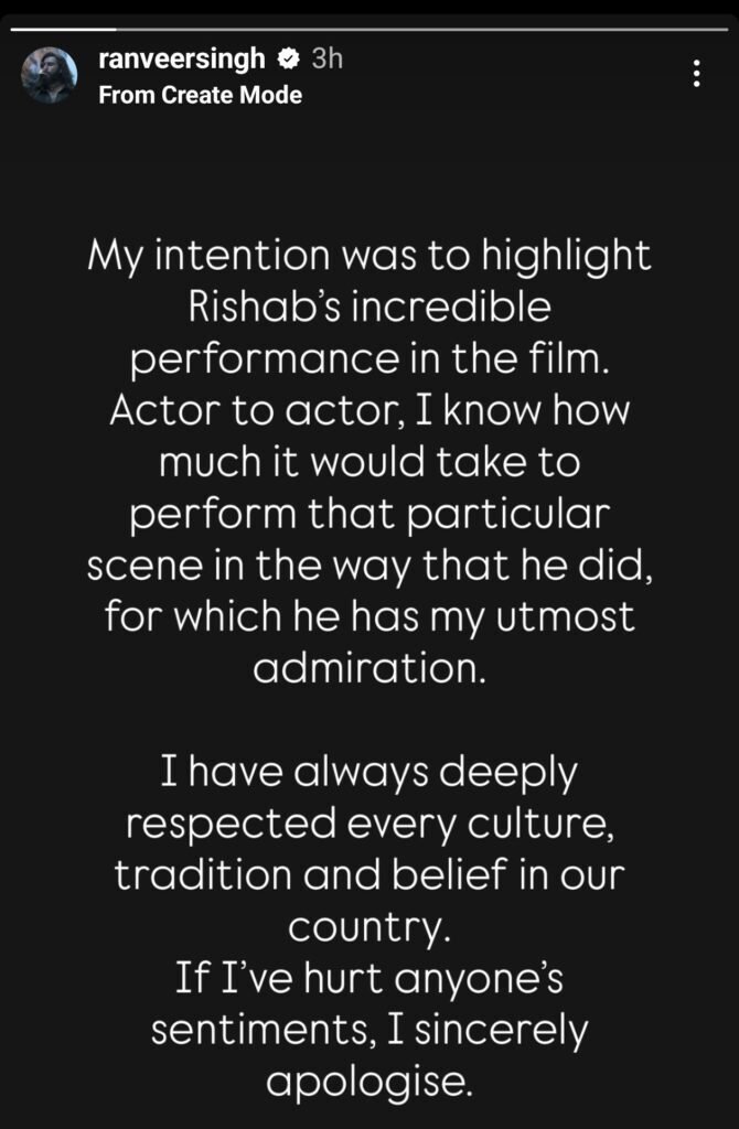 His post reads, “My intention was to highlight Rishabh’s incredible performance in the film. Actor to actor, I know how much it would take to perform that particular scene in the way that he did, for which he has my utmost admiration. I have always deeply respected every culture, tradition and belief in our country. If I’ve hurt anyone’s sentiments, I sincerely apologise.”