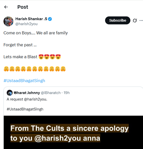అందుకు సోషల్ మీడియా లో స్పందించిన హరీష్ శంకర్, “మనమంతా ఒకే కుటుంబం” అని చెప్పుతూ అభిమానులను మళ్లీ అన్‌బ్లాక్ చేయడం ప్రారంభించారు. ఇలా దర్శకుడు – అభిమానుల మధ్య మళ్లీ ఐక్యత ఏర్పడటాన్ని, ఉస్తాద్ భగత్ సింగ్ విడుదలకు ముందు ఒక మంచి సంకేతంగా పవన్ అభిమానులు భావిస్తున్నారు.