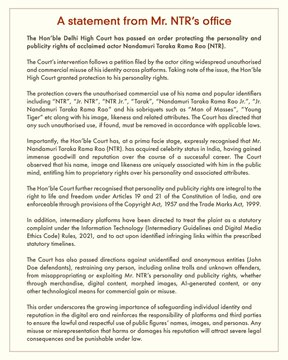 ఇంకా, గుర్తు తెలియని లేదా అనామక వ్యక్తులు కూడా ఎన్టీఆర్ గుర్తింపును దుర్వినియోగం చేయకుండా కోర్టు ఆంక్షలు విధించింది. ఆయన ప్రతిష్టకు భంగం కలిగించేలా పేరు లేదా రూపాన్ని వాడితే, అది తీవ్రమైన నేరంగా పరిగణించబడుతుందని, కఠిన చట్టపరమైన చర్యలు తప్పవని కోర్టు స్పష్టం చేసింది.