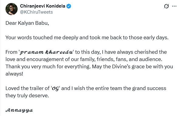 Your words touched me deeply and took me back to those early days. From ‘𝓹𝓻𝓪𝓷𝓪𝓶 𝓴𝓱𝓪𝓻𝓮𝓮𝓭𝓾’ to this day, I have always cherished the love and encouragement of our family, friends, fans, and audience. Thank you very much for everything. May the Divine’s grace be with you always! Loved the trailer of ‘𝓞𝓖’ and I wish the entire team the grand success they truly deserve. 𝓐𝓷𝓷𝓪𝔂𝔂𝓪”.