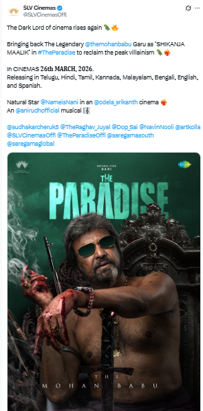 మోహన్ బాబు కూడా తన పోస్టర్ ని షేర్ చేస్తూ, “Stepping into the shadows as SHIKANJA MAALIK in #𝐓𝐡𝐞𝐏𝐚𝐫𝐚𝐝𝐢𝐬𝐞—my name, my game, my revenge. @odela_srikanth’s vision is raw and gripping. This one’s built to hit hard. In theaters March 26, 2026. Get Ready for the intensity!” అని తన ఫాన్స్ కి ఒక పెద్ద ట్రీట్ ఇచ్చాడు…