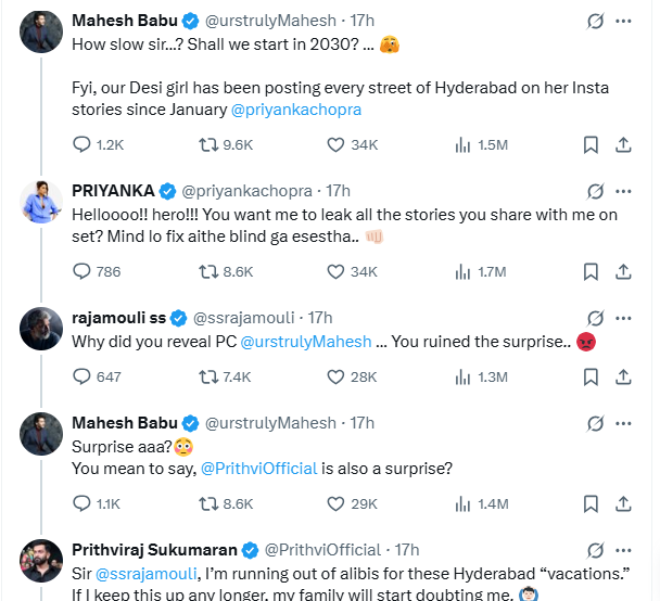 వెంటనే రాజమౌళి, ప్రియాంకా చోప్రా, పృథ్విరాజ్ సుకుమారన్ కూడా ఆ చిట్ చాట్‌లో చేరడంతో ఫ్యాన్స్‌ పండగ చేసుకున్నారు. ఈ సరదా సంభాషణతో ప్రియాంకా చోప్రా హీరోయిన్‌గా, పృథ్విరాజ్ విలన్‌గా ఉన్నట్టు క్లారిటీ వచ్చింది. త్వరలోనే వీరిద్దరి ఫస్ట్ లుక్ పోస్టర్లు, తరువాత మహేష్ బాబు లుక్ బయటకు రానున్నట్టు ఫిలిం సర్కిల్స్ చెబుతున్నాయి.