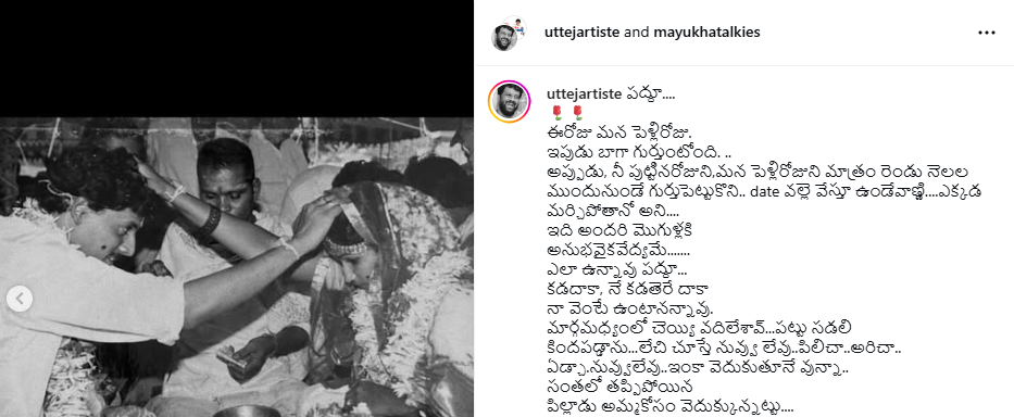 ఉత్తేజ్… అసలు ఈ నటుడు కి పరిచయం అవసరమా… మన అందరికి తెలిసిన వ్యక్తి… మంచి ఆర్టిస్ట్… తెర పై నవ్వులు పూయించగలడు అలానే ఏడిపించగలడు కూడా… సినిమాలనే కాదు బయట కూడా చాల యాక్టీవ్ గా వుండే ఉత్తేజ్ ఈరోజు సోషల్ మీడియా లో చేసిన పోస్ట్ తో అభిమానులని ఏడిపించేసాడు… ఈరోజు పెళ్లి రోజు కావడం తో తన భార్య ని గుర్తు చేసుకుని ఒక మంచి పోస్ట్ చేసాడు…