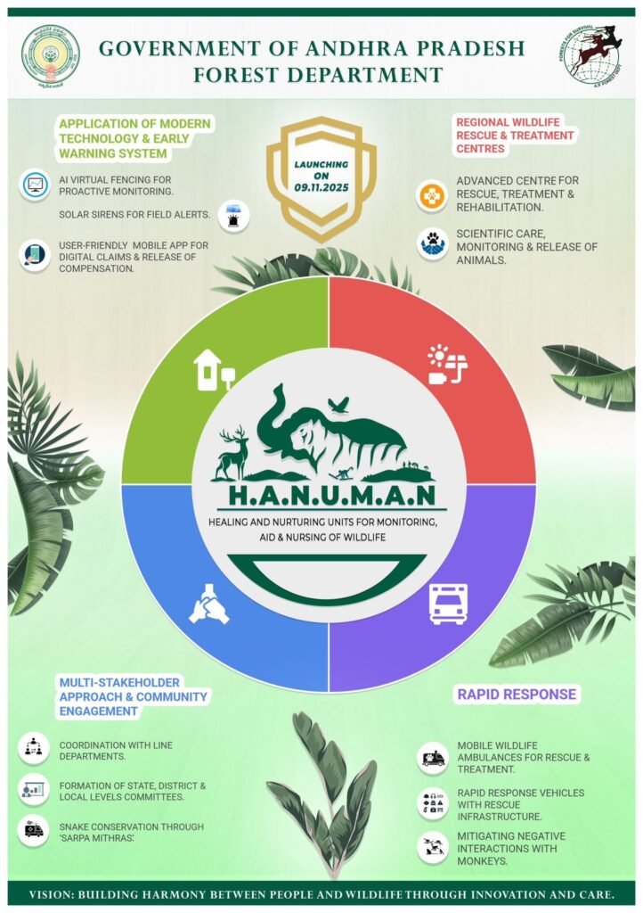 మానవులు, ఏనుగుల మధ్య సంఘర్షణను నివారించడంతో పాటు సరికొత్త సాంకేతికతతో అటవీ జంతువులకు సంరక్షణ చేపట్టేందుకు రాష్ట్ర అటవీశాఖ రూపొందించిన ‘హనుమాన్’ (Healing And Nurturing Units for Monitoring, Aid & Nursing of Wildlife) ప్రాజెక్ట్ వివరాలను రాష్ట్ర ఉప ముఖ్యమంత్రి, అటవీ పర్యావరణ శాఖ మంత్రి పవన్ కళ్యాణ్ తెలుసుకున్నారు. 11 అంశాలతో కూడిన ఈ ప్రాజెక్ట్ ను అటవీశాఖ అధికారులు పవర్ పాయింట్ ప్రజెంటేషన్ ద్వారా పవన్ కళ్యాణ్ కు వివరించారు.