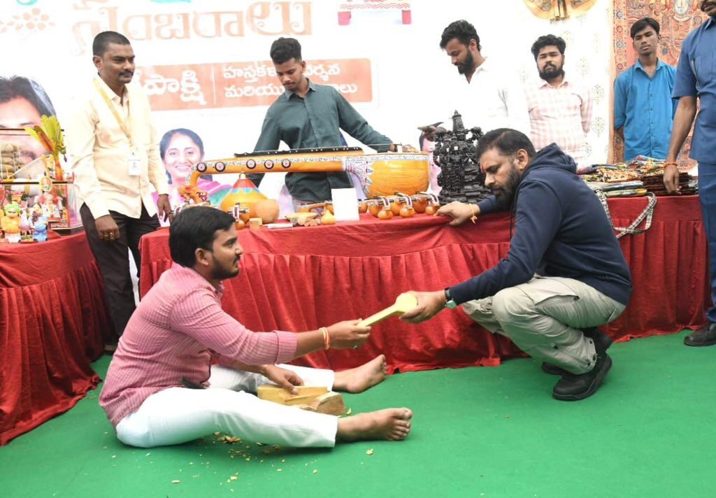 చేనేత, జౌళి, చేతివృత్తులు, మహిళా, శిశు సంక్షేమ శాఖల ఆధ్వర్యంలో ఏర్పాటు చేసిన స్టాళ్లను ఉప ముఖ్యమంత్రి పవన్ కళ్యాణ్ సందర్శించారు. చేనేత కళాకారులను పలుకరించి స్వయంగా రాట్నం వడికి, మగ్గాన్ని పరిశీలించారు. జౌళి శాఖ ఆధ్వర్యంలో ఏర్పాటు చేసిన చేనేత వస్త్రాలను స్టాళ్లను తిలకించారు. ఉప్పాడ చీరలు, కలంకారీ తదితర వస్త్రాల మీద అద్దిన కళలు ఉప ముఖ్యమంత్రి పవన్ కళ్యాణ్ ను ఆకట్టుకున్నాయి. నేతన్నలు ప్రత్యేకంగా రూపొందించిన కోటును ధరించి వారిని ఉత్సాహపరిచారు. తోలు బొమ్మల కళాకారులతో ముచ్చటించారు. లేపాక్షి స్టాల్ లో శ్రీనివాసుని ప్రతిమలను తిలకించారు. అనంతరం గర్భిణి స్త్రీలకు ఉప ముఖ్యమంత్రి పవన్ కళ్యాణ్ శ్రీమంతం వేడుక నిర్వహించారు. అదే స్టాల్ లో చిన్నారులకు బోగి పళ్లు పోసి చిరాయుష్షు కలగాలని ఆశీర్వదించారు. ఏటికొప్పాక లక్క బొమ్మలు, బొబ్బిలి వీణలను పరిశీలించారు. వీణతో తంత్రిని మీటి సంగీత ధ్వనులను ఆస్వాదించారు.