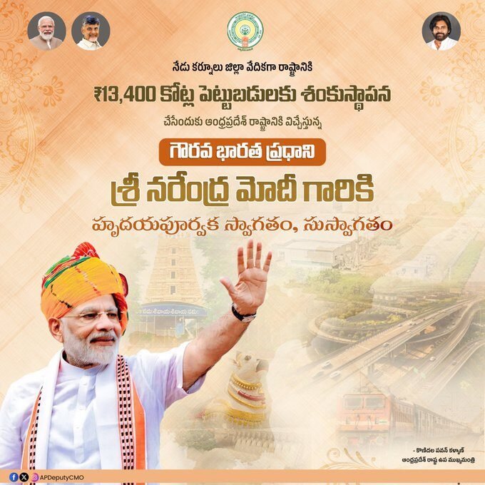 నేడు కర్నూలు జిల్లా వేదికగా రాష్ట్రానికి ₹13,400 కోట్ల పెట్టుబడులకు శంకుస్థాపన చేసేందుకు ఆంధ్రప్రదేశ్ రాష్ట్రానికి గౌరవ భారత ప్రధాని మోడీ వచ్చిన సంగతి తెలిసిందే… కర్నూలు, ఓర్వకల్లు విమానాశ్రయంలో మోడీ కి ఆంధ్రప్రదేశ్ రాష్ట్ర ప్రభుత్వం తరపున గౌరవ రాష్ట్ర గవర్నర్ జస్టిస్ అబ్దుల్ నజీర్ గారు, గౌరవ ముఖ్యమంత్రి చంద్రబాబు, డిప్యూటీ సీఎం పవన్ కళ్యాణ్ ఘనస్వాగతం పలికారు.